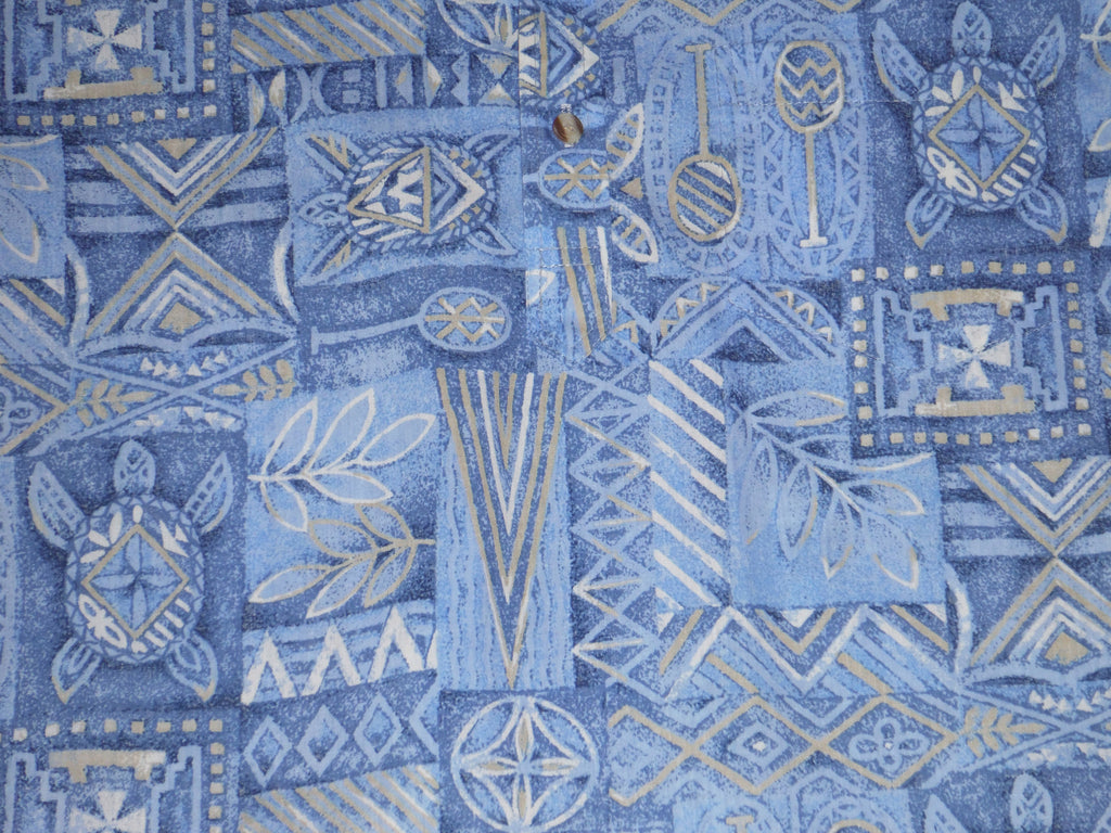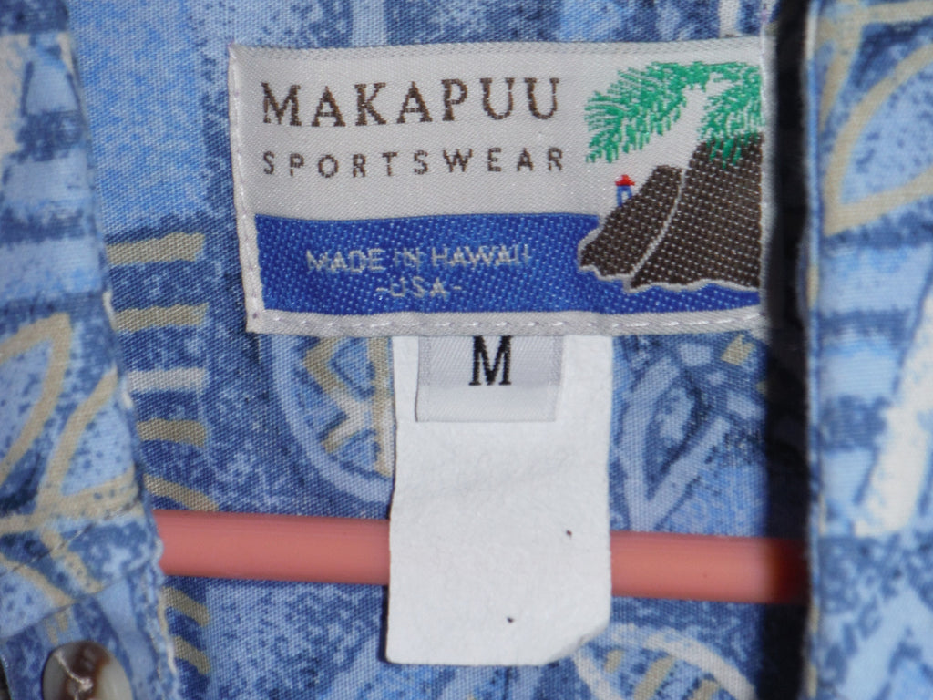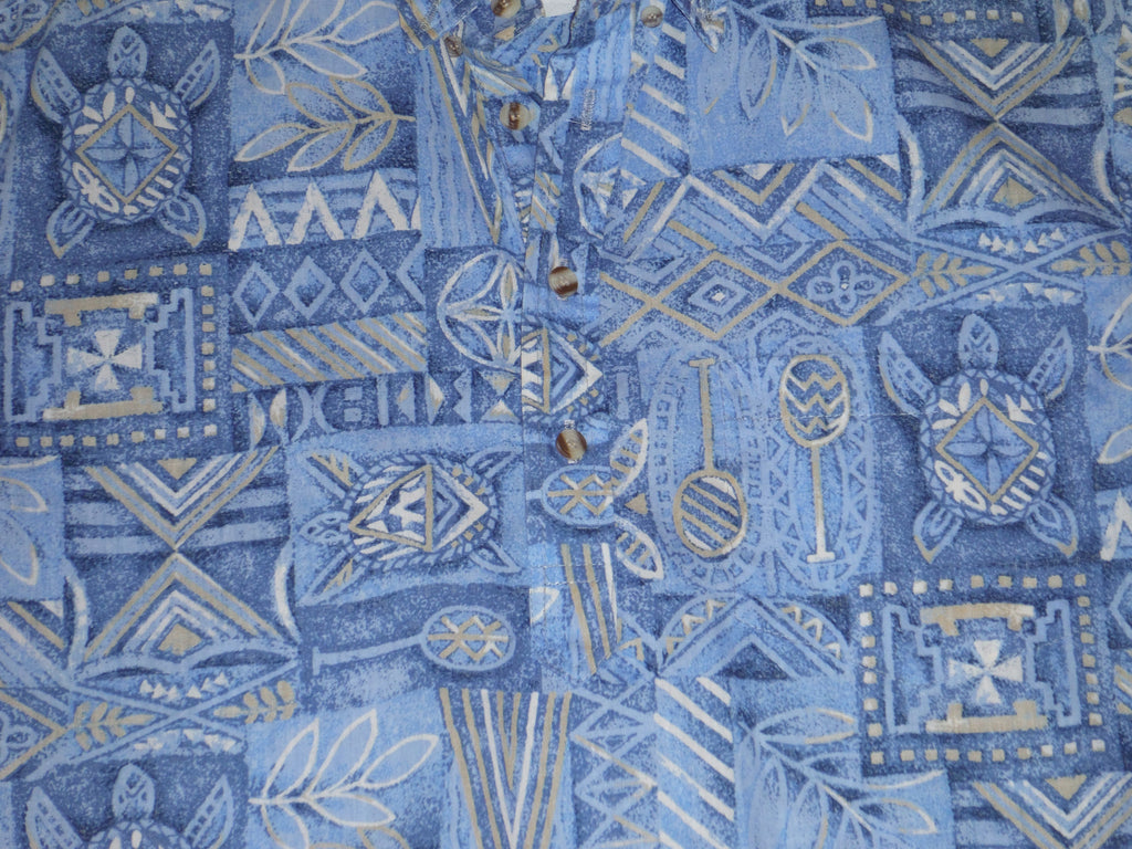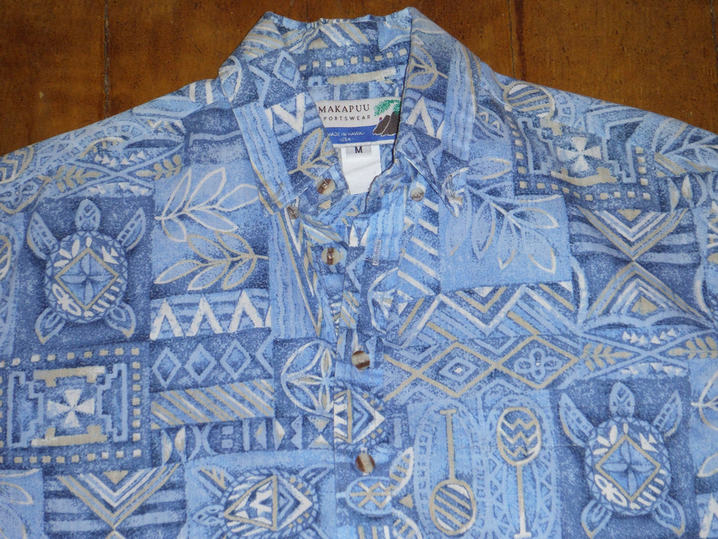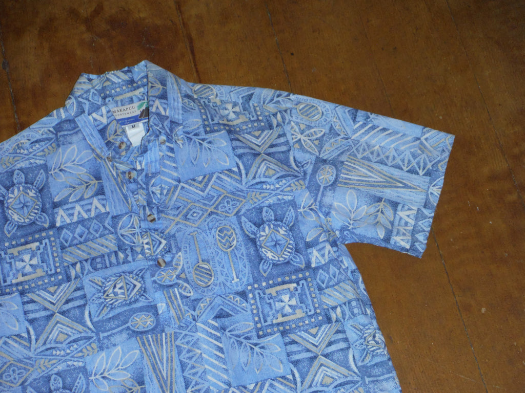 This is a vintage pullover from the 70's by Makapuu sportswear. Features a beautiful kapa style print with canoe paddles,flowers and honu (turtles). This shirt is in excellent condition.